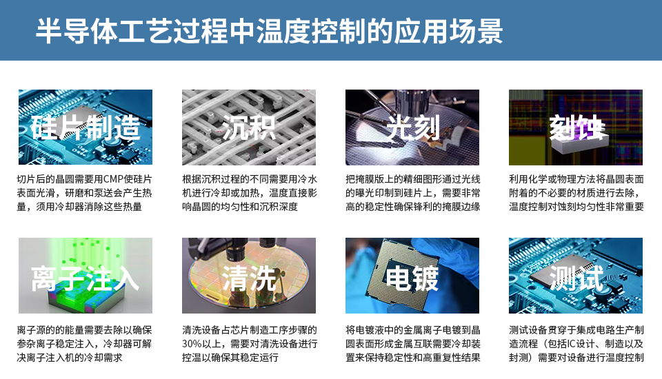 主要應用與半導體生產過程中及測試環節的溫度精準控制40°C以內,加熱方式采用壓縮機熱氣加熱