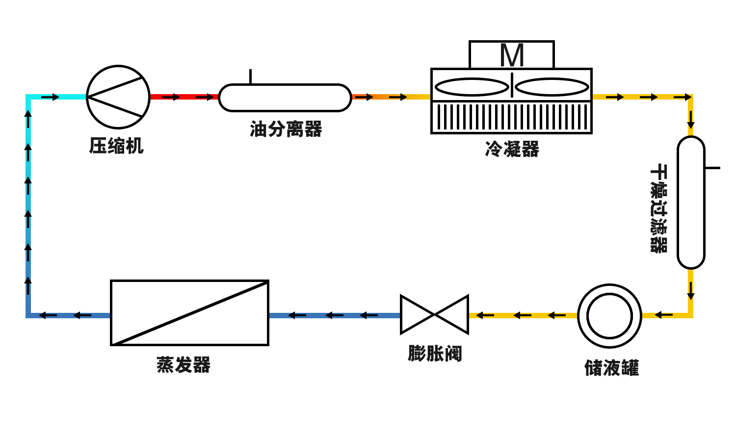 - 蒸發(fā)器:當(dāng)制冷系統(tǒng)的氟利昂液體進入膨脹閥節(jié)流后被送入蒸發(fā)器時,屬于蒸發(fā)過程。此時,它需要吸收大量的熱量來逐漸降低化合價和質(zhì)量溫度,以達(dá)到制冷和冷卻的效果。