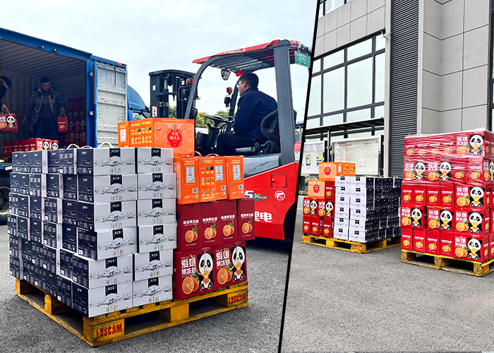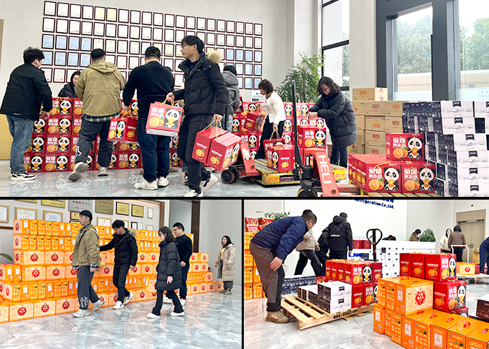 現場熱火朝天~大家齊心協力,卸下一箱箱年貨。沉甸甸的年貨,承載著新春團圓的期望,飽含公司對員工的濃濃關愛與真摯祝福。