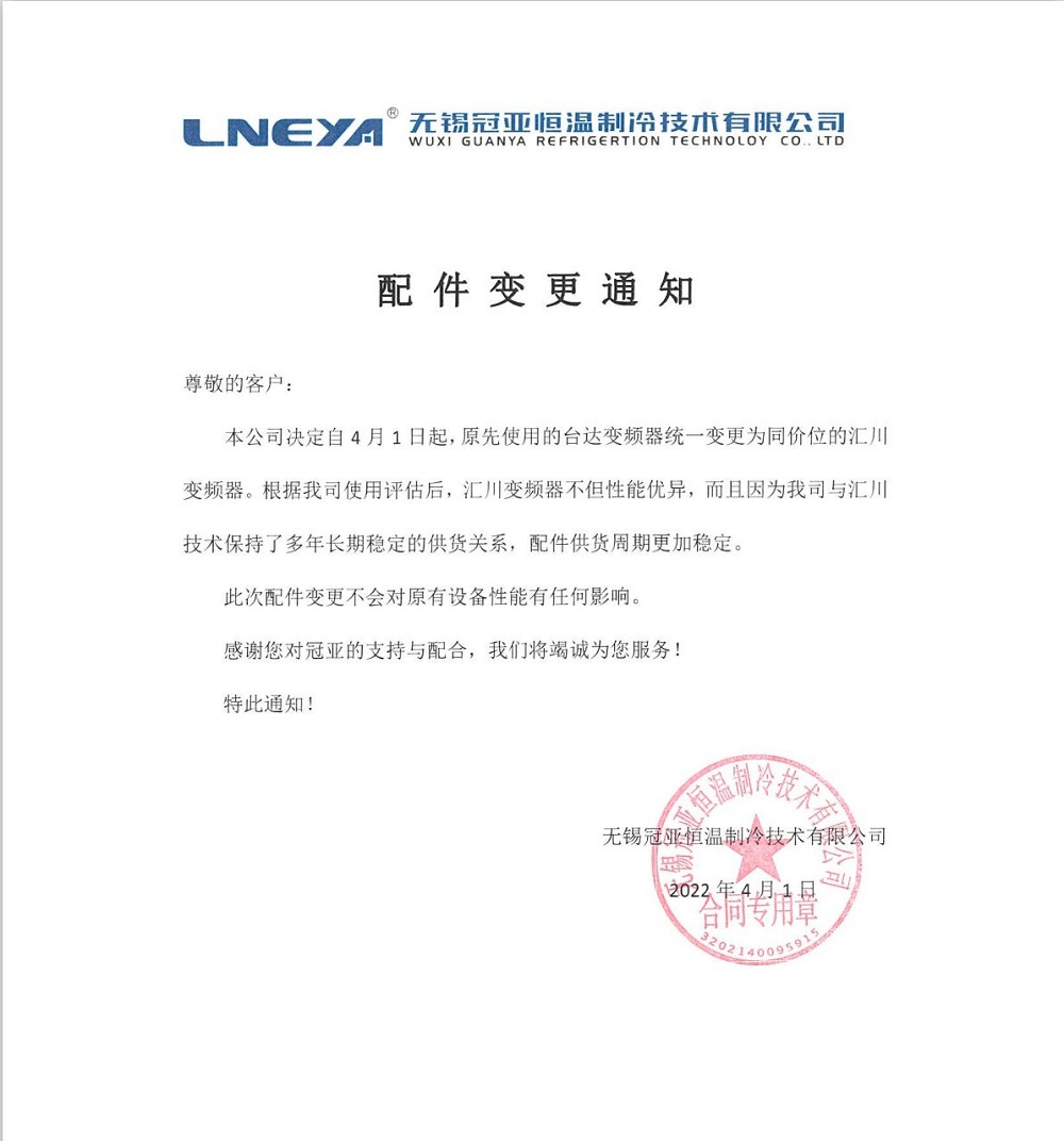 配件變更通知 2022/04/01 分類:新聞 1042尊敬的客戶:本公司決定自4月1日起,原先使用的臺達變頻器統一變更為同價位的匯川變頻器。根據我司使用評估后,匯川變頻器不但性能優異,而且因為我司與匯川技術保持了多年長期穩定的供貨關系,配件供貨周期更加穩定。此次配件變更不會對原有設備性能有任何影響。感謝您對冠亞的支持與配合,我們將竭誠為您服務!特此通知!本內容版權歸無錫冠亞恒溫制冷技術有限公司所有,轉載請說明出處m.xiaofentu.com,盜版必究!咨詢合作:400-100-3173 上一篇: 團建 下一篇: 配件變更通知