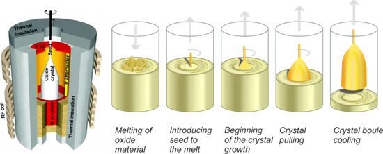 制造工藝始于高質(zhì)量半導(dǎo)體晶體的生長,它是生產(chǎn)電子器件的基礎(chǔ)材料。對于基于硅的器件,zui常見的晶體生長方法是直拉法(Czochralski法),該方法在坩堝中熔化高純度硅,隨后將其冷卻至接近凍結(jié)點(diǎn),通過旋轉(zhuǎn)種子晶體從熔體中拉出單晶,并切片成薄片晶圓。這種方法可以生產(chǎn)具有均勻晶體結(jié)構(gòu)和優(yōu)良電學(xué)特性的單晶錠。其他廣泛使用的方法還包括Kyropoulos方法、Float Zone方法、Verneuil方法、Bridgman方法等。此外,晶圓經(jīng)過拋光和清洗以創(chuàng)建一個(gè)潔凈表面用于后續(xù)處理步驟。