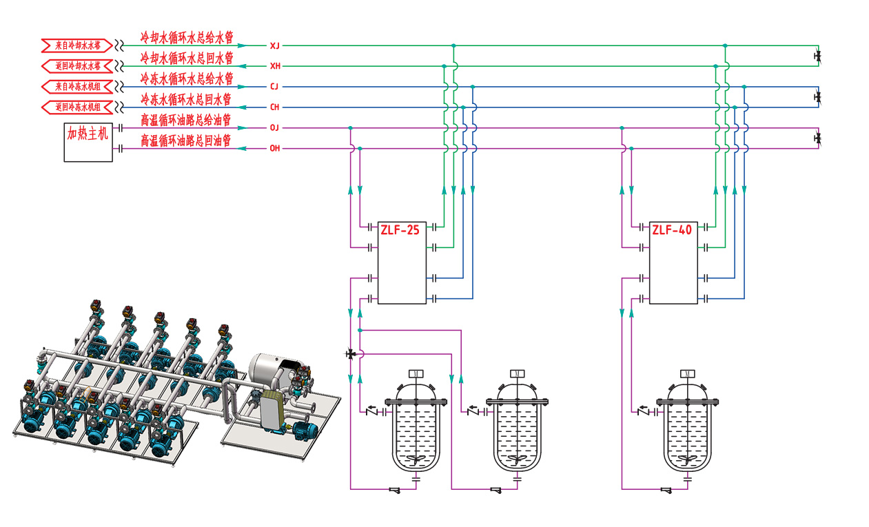 | ZLF-N | 采用主冷源/或主熱源通過比例調節系統流量,控制進入反應釜夾套的熱量,同時還有一組用于加熱或冷卻的換熱器控制升溫或降溫 |